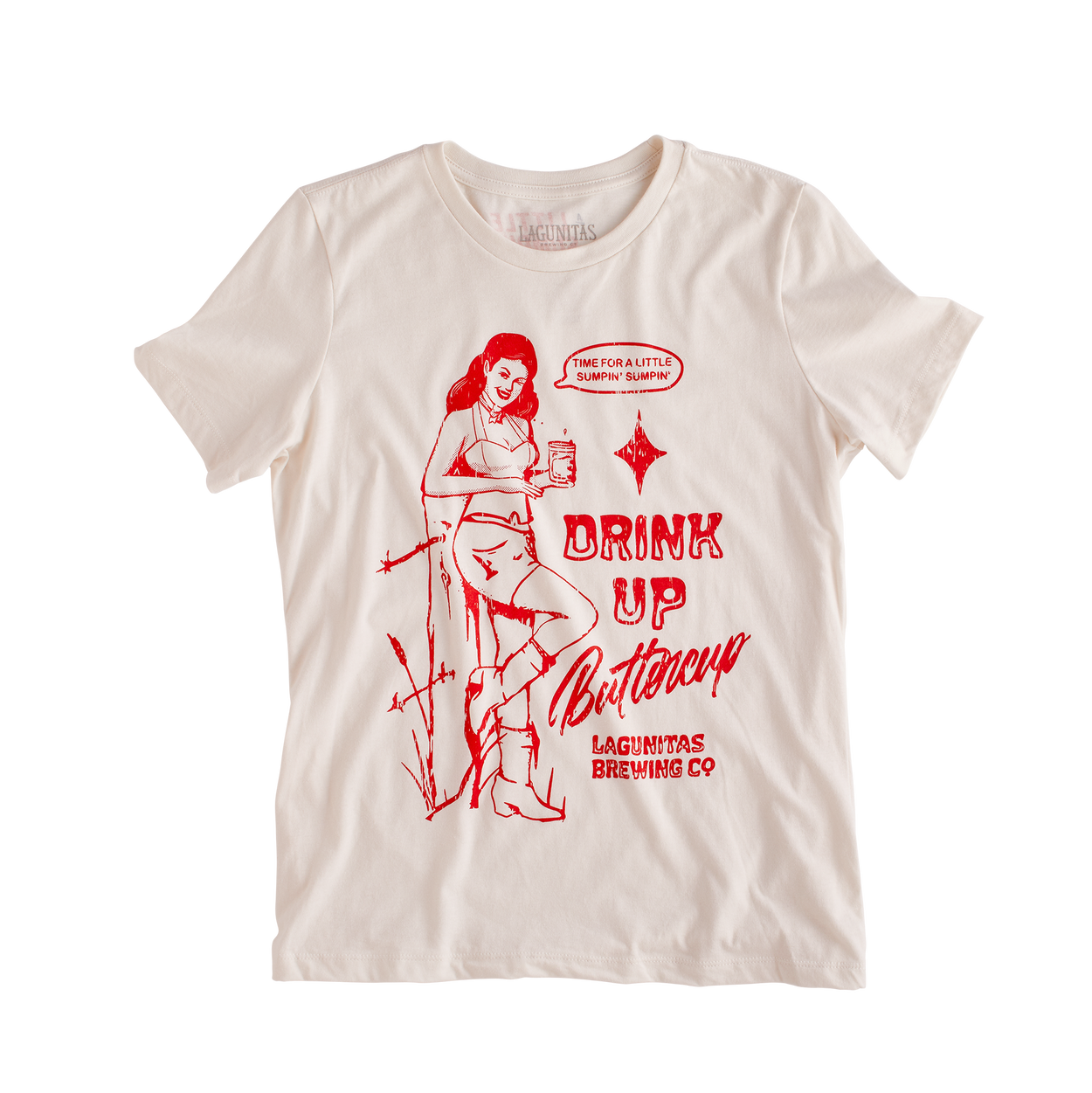Show your love for a Little Sumpin’ Sumpin’ with our “Drink up Buttercup” Ladies Loose Fit tee! This soft cream shirt features a striking bold red print, paying homage to the original a Little Sumpin’ Sumpin’ design. With its vintage vibe, this tee is perfect for those who appreciate a touch of nostalgia while enjoying their favorite brews.